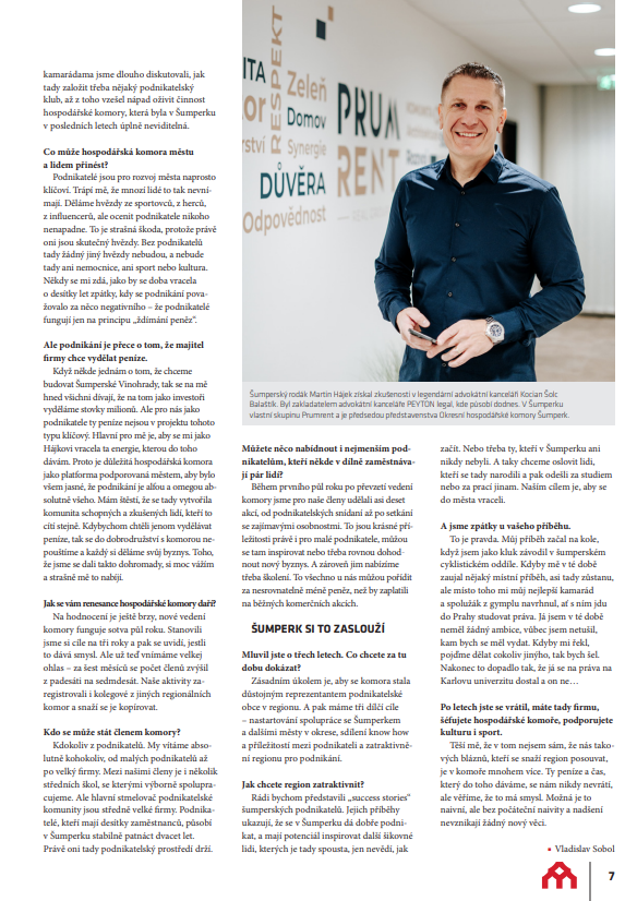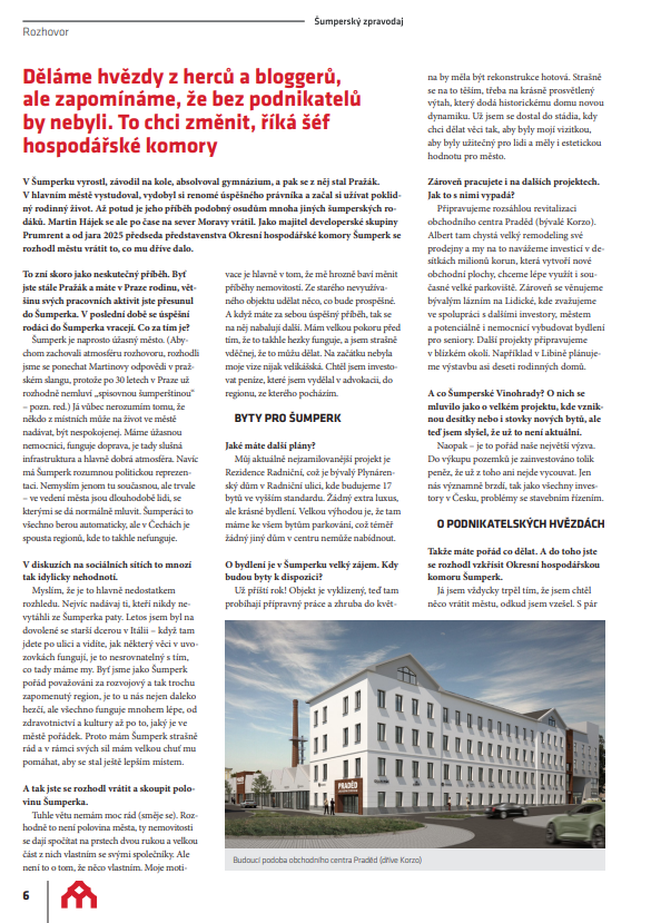 Podnikatelé jsou často vnímáni samozřejmě – přitom bez nich by města nemohla fungovat. Martin Hájek, předseda Okresní hospodářské komory Šumperk a zástupce developerské skupiny Prumrent, v rozhovoru pro Šumperský zpravodaj otevřeně mluví o návratu do regionu, odpovědnosti podnikatelů vůči městu i o projektech, které mají Šumperk posunout dál.